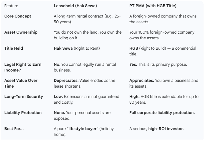 For foreign investors, the Bali dream of a high-yield villa and passive cash flow hinges on one critical, upfront decision: your legal structure. The entire market essentially boils down to two paths: a Leasehold (Hak Sewa) or a PT PMA (Foreign-Owned Company). This isn't just legal paperwork; it's the fundamental choice that determines if you are buying a depreciating "rental" or building a genuine, scalable, and legally-defensible business asset.